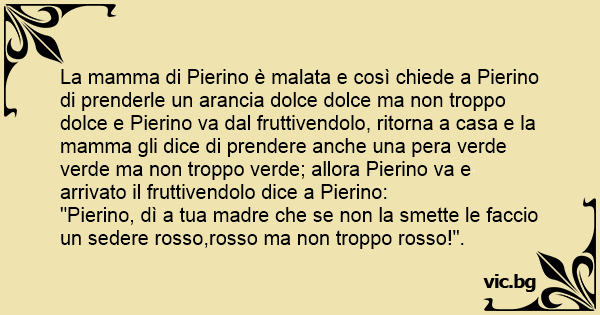 La mamma di Pierino è malata e così chiede a Pierino di prenderle un arancia dolce dolce ma non troppo dolce e Pierino va dal fruttivendolo, ritorna a casa e la mamma gli dice di prendere anche una pera verde verde ma non troppo verde; allora Pierino va e arrivato il fruttivendolo dice a Pierino: