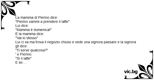 , lo porta a casa sua, si spreme le тетте e gli dà il latte. Pierino va a casa e lo dà alla mamma, la mamma lo beve e dice:
