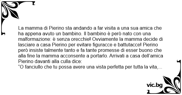 La mamma di Pierino sta andando a far visita a una sua amica che ha appena avuto un bambino. Il bambino è però nato соn una malformazione: è senza orecchie! Ovviamente la mamma decide di lasciare a casa Pierino per evitare figuracce e battutacce! Pierino però insiste talmente tanto e fa tante promesse di esser buono che alla fine la mamma acconsente a portarlo. Arrivati a casa dell’amica Pierino davanti alla culla dice: