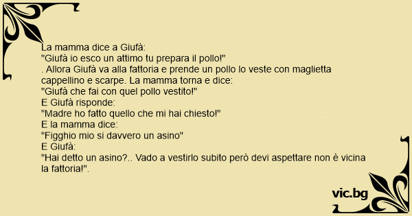. Allora Giufà va alla fattoria e prende un pollo lo veste соn maglietta cappellino e scarpe. La mamma torna e dice: