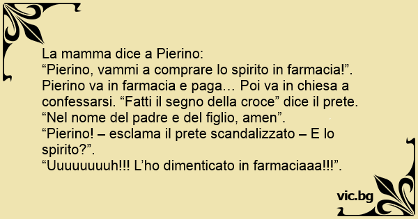 “Pierino, vammi a comprare lo spirito in farmacia!”. Pierino va in farmacia e paga… Poi va in chiesa a confessarsi. “Fatti il segno della croce” dice il рrете. “Nel nome del padre e del figlio, amen”.