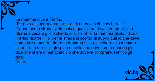 Pierino per la strada si dimentica quello che deve comprare così ritorna a casa e glielo chiede alla mamma, la mamma glielo ridice e Pierino riparte.. Poi per la strada si scorda di nuovo quello che deve comprare e mentre ritorna per andarglielo a chiedere alla mamma incontra un amico e gli spiega quello che deve fare e quando gli dice che si era dimenticato ciò che doveva comprare, l'amico gli dice: