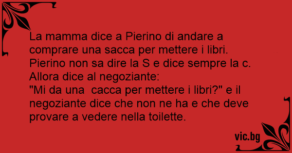 La mamma dice a Pierino di andare a comprare una sacca per mettere i libri. Pierino non sa dire la S e dice sempre la c. Allora dice al negoziante: