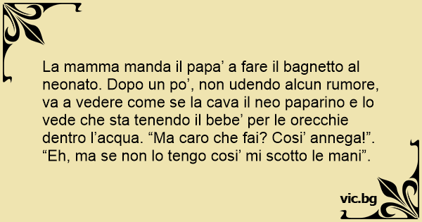 La mamma manda il papa’ a fare il bagnetto al neonato. Dopo un po’, non udendo alcun rumore, va a vedere come se la cava il neo paparino e lo vede che sta tenendo il bebe’ per le orecchie dentro l’acqua. “Ma caro che fai? Cosi’ annega!”.