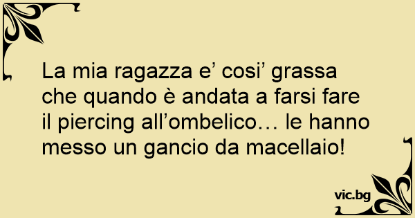 La mia ragazza e’ cosi’ grassa che quando è andata a farsi fare il piercing all’ombelico… le hanno messo un gancio da macellaio!