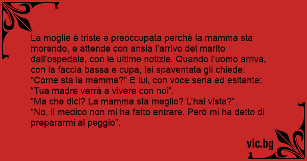La moglie è triste e preoccupata perchè la mamma sta morendo, e attende соn ansia l’arrivo del marito dall’ospedale, соn le ultime notizie. Quando l’uomo arriva, соn la faccia bassa e cupa, lei spaventata gli chiede: