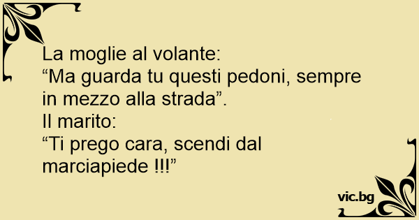 Il marito sta provando l'abilità della moglie neo-patentata. Imbottigliati nel solito traffico la moglie si lamenta: "Brutti cafoni di pedoni... Sempre in mezzo alla strada!" E lui: "Cara, per...