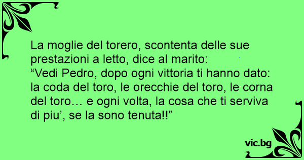 La moglie del torero, scontenta delle sue prestazioni a letto, dice al marito: “Vedi Pedro, dopo ogni vittoria ti hanno dato: la coda del toro, le orecchie del toro, le corna del toro… e ogni volta, la cosa che ti serviva di piu’, se la sono tenuta!!”