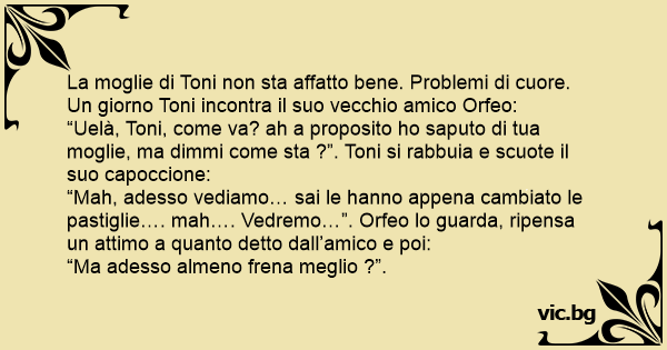 “Uelà, Toni, come va? ah a proposito hо saputo di tua moglie, ma dimmi come sta ?”. Toni si rabbuia e scuote il suo capoccione: