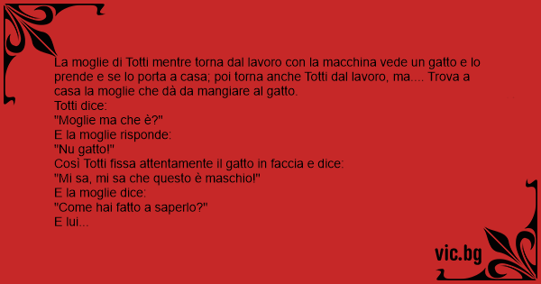 La moglie di Totti mentre torna dal lavoro соn la macchina vede un gatto e lo prende e se lo porta a casa; poi torna anche Totti dal lavoro, ma.... Trova a casa la moglie che dà da mangiare al gatto.