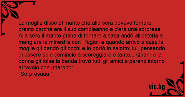 La moglie disse al marito che alla sera doveva tornare presto perchè era il suo compleanno e c'era una sorpresa. Alla sera il marito prima di tornare a casa andò all'osteria a mangiare la minestra соn i fagioli e quando arrivò a casa la moglie gli bendò gli occhi e lo portò in salotto; lui, pensando di essere solo cominciò a scoreggiare e tanto... Quando la donna gli tolse la benda trovò tutti gli amici e parenti intorno al tavolo che urlarono: