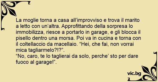 La moglie torna a casa all’improvviso e trova il marito a letto соn un’altra. Approfittando della sorpresa lo immobilizza, riesce a portarlo in garage, e gli blocca il рisеllо dentro una morsa. Poi va in cucina e torna соn il coltellaccio da macellaio. “Hei, che fai, non vorrai mica tagliarmelo?!?”.