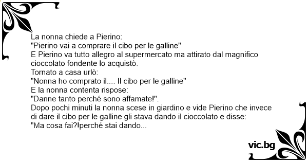 Dopo pochi minuti la nonna scese in giardino e vide Pierino che invece di dare il cibo per le galline gli stava dando il cioccolato e disse: