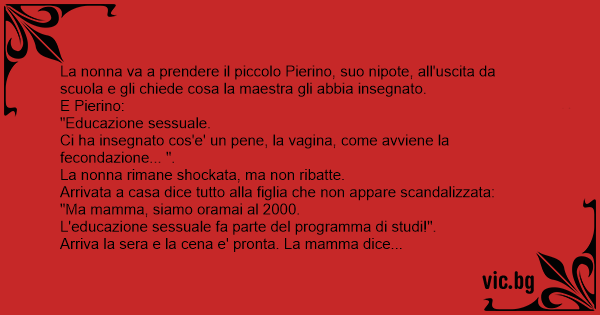 La nonna va a prendere il piccolo Pierino, suo nipote, all'uscita da scuola e gli chiede cosa la maestra gli abbia insegnato.