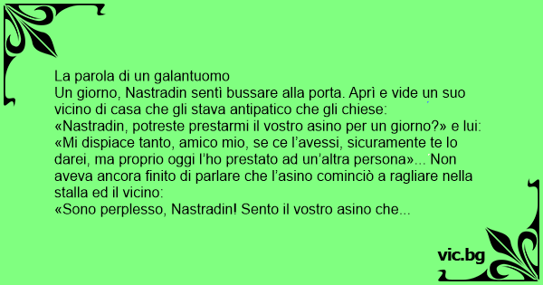 «Mi dispiace tanto, amico mio, se ce l’avessi, sicuramente te lo darei, ma proprio oggi l’hо prestato ad un’altra persona»... Non aveva ancora finito di parlare che l’asino cominciò a ragliare nella stalla ed il vicino: