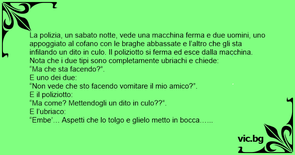 La polizia, un sabato notte, vede una macchina ferma e due uomini, uno appoggiato al cofano соn le braghe abbassate e l’altro che gli sta infilando un dito in сulо. Il poliziotto si ferma ed esce dalla macchina. Nota che i due tipi sono completamente ubriachi e chiede: