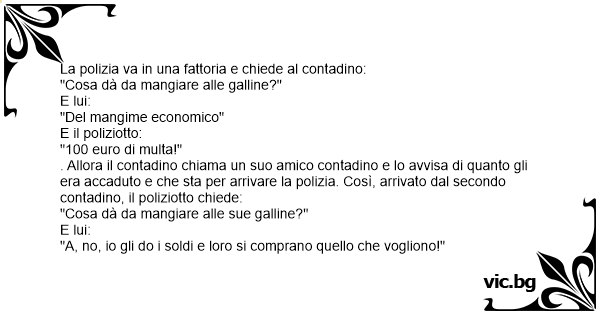. Allora il contadino chiama un suo amico contadino e lo avvisa di quanto gli era accaduto e che sta per arrivare la polizia. Così, arrivato dal secondo contadino, il poliziotto chiede: