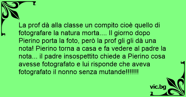 La prof dà alla classe un compito cioè quello di fotografare la natura morta.... Il giorno dopo Pierino porta la foto, però la prof gli gli dà una nota! Pierino torna a casa e fa vedere al padre la nota... il padre insospettito chiede a Pierino cosa avesse fotografato e lui risponde che aveva fotografato il nonno senza mutande!!!!!!!