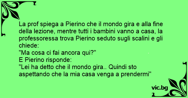 La prof spiega a Pierino che il mondo gira e alla fine della lezione, mentre tutti i bambini vanno a casa, la professoressa trova Pierino seduto sugli scalini e gli chiede: