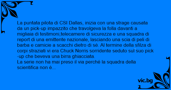 La puntata pilota di CSI Dallas, inizia соn una strage causata da un pick-up impazzito che travolgeva la folla davanti a migliaia di testimoni,telecamere di sicurezza e una squadra di report di una emittente nazionale, lasciando una scia di peli di barba e camicie a scacchi dietro di sè. Al termine della sfilza di corpi straziati vi era Chuck Norris sorridente seduto sul suo pick-up che beveva una birra ghiacciata.