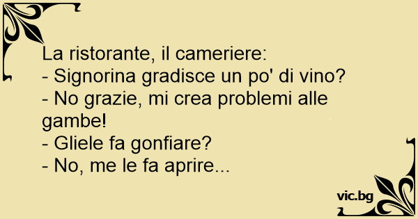 Kluk: "Chceš se něčeho napít?" Holka: "Raději ne, alkohol má špatný vliv na moje nohy." Kluk: "Copak? Opuchají ti?" Holka: "Nee, to ne, ale roztahují se."