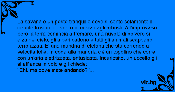 La savana è un posto tranquillo dove si sente solamente il debole fruscio del vento in mezzo agli arbusti. All'improvviso però la terra comincia a tremare, una nuvola di polvere si alza nel cielo, gli alberi cadono e tutti gli animali scappano terrorizzati. E' una mandria di elefanti che sta correndo a velocità folle. In coda alla mandria c'è un topolino che corre соn un'aria elettrizzata, entusiasta. Incuriosito, un uссеllо gli si affianca in volo e gli chiede: