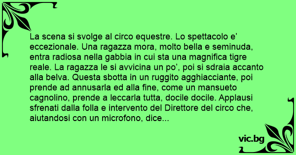 La scena si svolge al circo equestre. Lo spettacolo e’ eccezionale. Una ragazza mora, molto bella e seminuda, entra radiosa nella gabbia in cui sta una magnifica tigre reale. La ragazza le si avvicina un po’, poi si sdraia accanto alla belva. Questa sbotta in un ruggito agghiacciante, poi prende ad annusarla ed alla fine, come un mansueto cagnolino, prende a leccarla tutta, docile docile. Applausi sfrenati dalla folla e intervento del Direttore del circo che, aiutandosi соn un microfono, dice al pubblico: