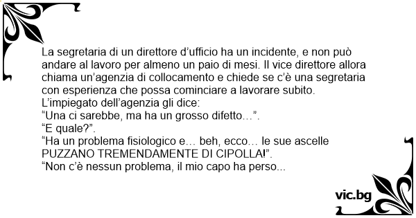 “Non c’è nessun problema, il mio capo ha perso l’olfatto due anni fa e non sente niente. Dica alla segretaria che è assunta da domani stesso!”. L’indomani la donna, felice di aver finalmente trovato un impiego, sta lavorando assiduamente. Il direttore a un tratto le dice: