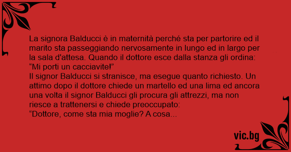 La signora Balducci è in maternità perché sta per partorire ed il marito sta passeggiando nervosamente in lungo ed in largo per la sala d'attesa. Quando il dottore esce dalla stanza gli ordina: