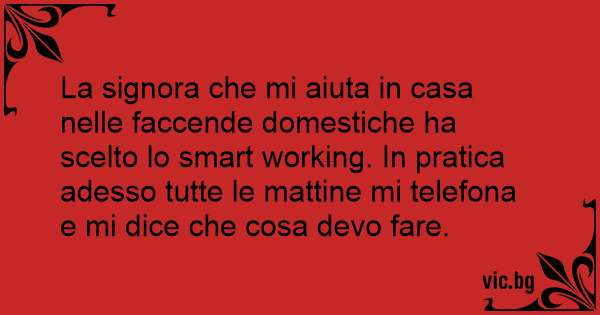 La signora che mi aiuta in casa nelle faccende domestiche ha scelto lo smart working. In pratica adesso tutte le mattine mi telefona e mi dice che cosa devo fare.