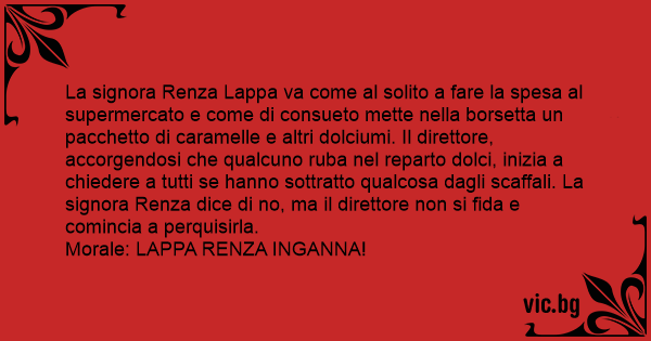 La signora Renza Lappa va come al solito a fare la spesa al supermercato e come di consueto mette nella borsetta un pacchetto di caramelle e altri dolciumi. Il direttore, accorgendosi che qualcuno ruba nel reparto dolci, inizia a chiedere a tutti se hanno sottratto qualcosa dagli scaffali. La signora Renza dice di no, ma il direttore non si fida e comincia a perquisirla.