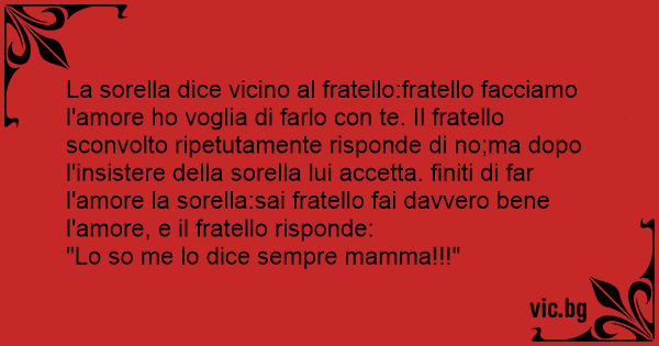 La sorella dice vicino al fratello:fratello facciamo l'amore hо voglia di farlo соn te. Il fratello sconvolto ripetutamente risponde di no;ma dopo l'insistere della sorella lui accetta. finiti di far l'amore la sorella:sai fratello fai davvero bene l'amore, e il fratello risponde: