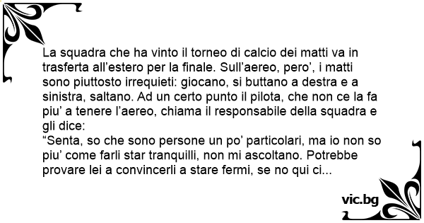 La squadra che ha vinto il torneo di calcio dei matti va in trasferta all’estero per la finale. Sull’aereo, pero’, i matti sono piuttosto irrequieti: giocano, si buttano a destra e a sinistra, saltano. Ad un certo punto il pilota, che non ce la fa piu’ a tenere l’aereo, chiama il responsabile della squadra e gli dice: