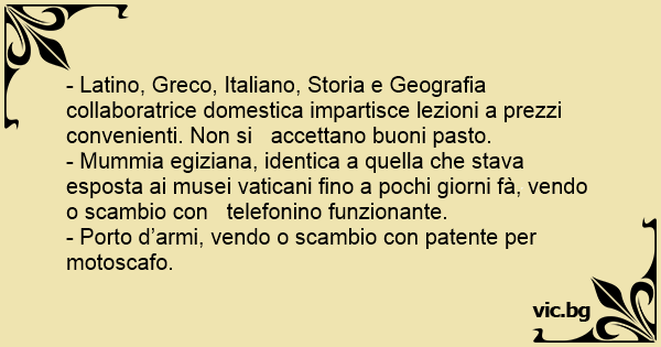- Latino, Greco, Italiano, Storia e Geografia collaboratrice domestica impartisce lezioni a prezzi convenienti. Non si accettano buoni pasto.
