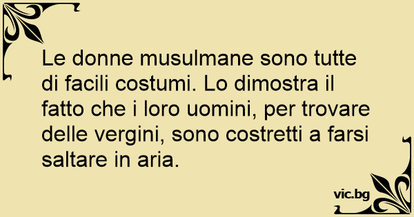 Le donne musulmane sono tutte di facili costumi. Lo dimostra il fatto che i loro uomini, per trovare delle vergini, sono costretti a farsi saltare in aria.
