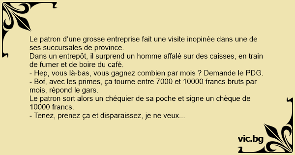 - Hep, vous là-bas, vous gagnez combien par mois ? Demande le PDG.
