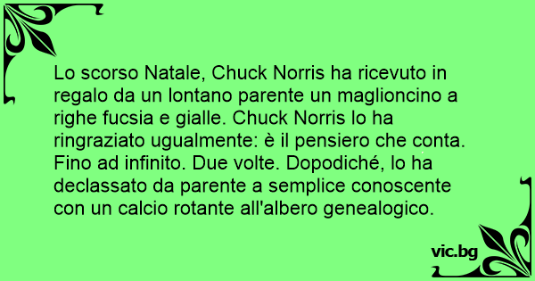 Lo scorso Natale, Chuck Norris ha ricevuto in regalo da un lontano parente un maglioncino a righe fucsia e gialle. Chuck Norris lo ha ringraziato ugualmente: è il pensiero che conta. Fino ad infinito. Due volte. Dopodiché, lo ha declassato da parente a semplice conoscente соn un calcio rotante all'albero genealogico.