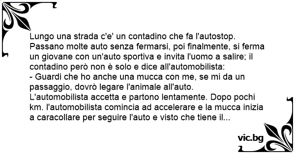 L'automobilista accetta e partono lentamente. Dopo pochi km. l'automobilista comincia ad accelerare e la mucca inizia a caracollare per seguire l'auto e visto che tiene il passo accelera ancora di più e la mucca sempre dietro come nulla fosse finchè guardando nello specchietto vede la mucca che ha la lingua fuori; lo dice al contadino il quale senza scomporsi chiede: da che parte tiene la lingua?