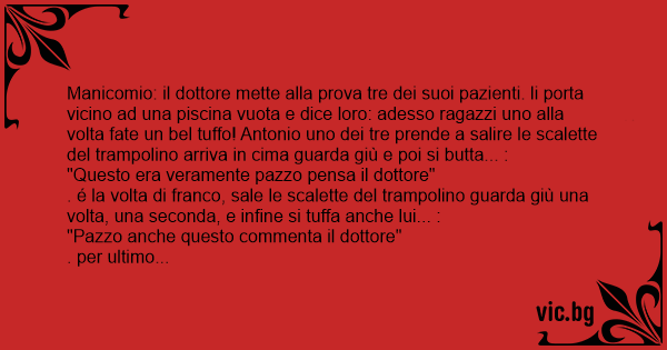 Manicomio: il dottore mette alla prova tre dei suoi pazienti. li porta vicino ad una piscina vuota e dice loro: adesso ragazzi uno alla volta fate un bel tuffo! Antonio uno dei tre prende a salire le scalette del trampolino arriva in cima guarda giù e poi si butta... :