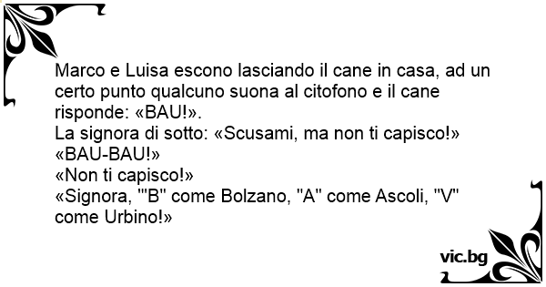 Marco e Luisa escono lasciando il cane in casa, ad un certo punto qualcuno suona al citofono e il cane risponde: «BAU!».