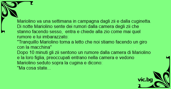 Mariolino va una settimana in campagna dagli zii e dalla cuginetta. Di notte Mariolino sente dei rumori dalla camera degli zii che stanno facendo sesso, entra e chiede alla zio come mai quel rumore e lui imbarazzato:
