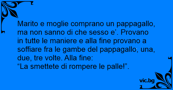 Marito e moglie comprano un pappagallo, ma non sanno di che sesso e’. Provano in tutte le maniere e alla fine provano a soffiare fra le gambe del pappagallo, una, due, tre volte. Alla fine:
