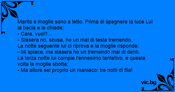 Marito e moglie sono a letto. Prima di spegnere la luce Lui la bacia e le chiede: