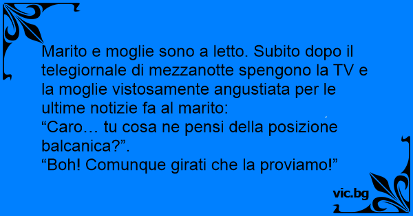 Marito e moglie sono a letto. Subito dopo il telegiornale di mezzanotte spengono la TV e la moglie vistosamente angustiata per le ultime notizie fa al marito: “Caro… tu cosa ne pensi della posizione balcanica?”. “Boh! Comunque girati che la proviamo!”