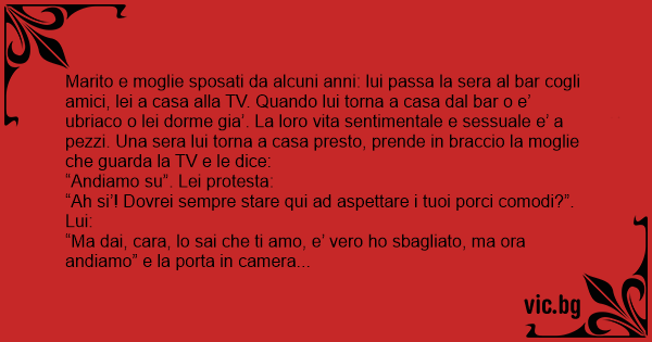Marito e moglie sposati da alcuni anni: lui passa la sera al bar cogli amici, lei a casa alla TV. Quando lui torna a casa dal bar o e’ ubriaco o lei dorme gia’. La loro vita sentimentale e sessuale e’ a pezzi. Una sera lui torna a casa presto, prende in braccio la moglie che guarda la TV e le dice: