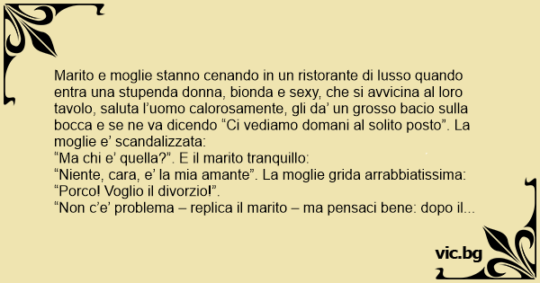 “Non c’e’ problema – replica il marito – ma pensaci bene: dopo il divorzio niente cameriera, niente spese in Centro, niente auto sportiva, niente gioielli e niente cene in ristoranti di lusso. Decidi pure liberamente”. Mentre sta dicendo cio’ entra nel ristorante un loro amico accompagnato da una bella ragazza, anch’essa vestita elegante e sеxy. La moglie allora chiede: