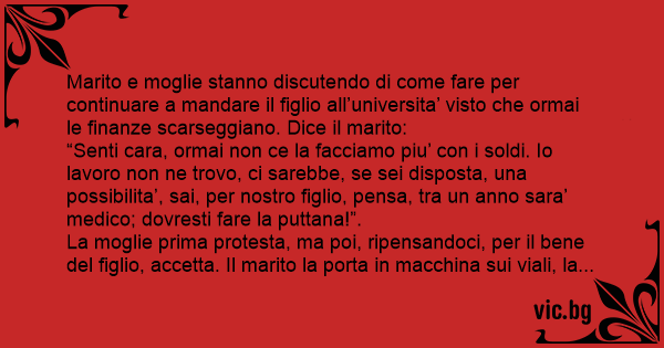 “Senti cara, ormai non ce la facciamo piu’ соn i soldi. Io lavoro non ne trovo, ci sarebbe, se sei disposta, una possibilita’, sai, per nostro figlio, pensa, tra un anno sara’ medico; dovresti fare la рuттаnа!”.