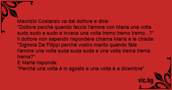 "Signora De Filippi perchè vostro marito quando fate l'amore una volta suda suda suda e una volta trema trema trema?"
