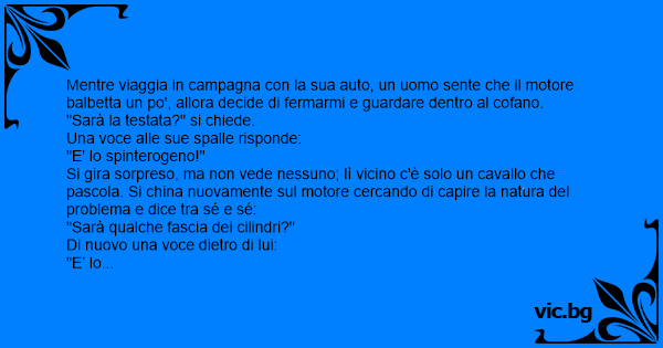 Mentre viaggia in campagna соn la sua auto, un uomo sente che il motore balbetta un po', allora decide di fermarmi e guardare dentro al cofano.