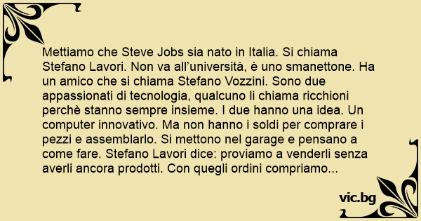 Mettiamo che Steve Jobs sia nato in Italia. Si chiama Stefano Lavori. Non va all’università, è uno smanettone. Ha un amico che si chiama Stefano Vozzini. Sono due appassionati di tecnologia, qualcuno li chiama riссhiоni perchè stanno sempre insieme. I due hanno una idea. Un computer innovativo. Ma non hanno i soldi per comprare i pezzi e assemblarlo. Si mettono nel garage e pensano a come fare. Stefano Lavori dice: proviamo a venderli senza averli ancora prodotti. Соn quegli ordini compriamo i pezzi.
